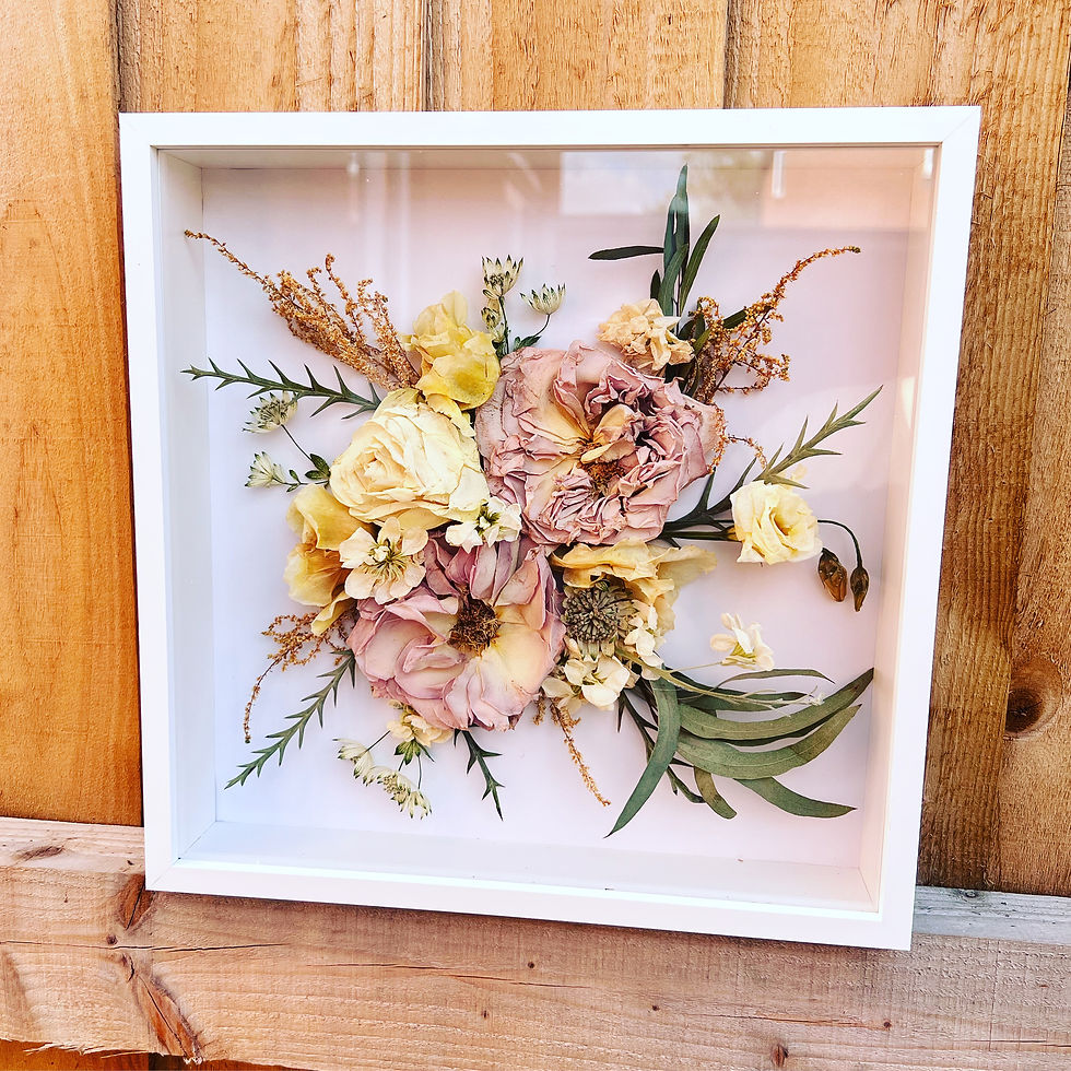 Each flower shadow box frame is a bespoke piece of art, designed and crafted to showcase your flowers as you remember them. Whether commemorating a wedding, anniversary, or other milestone, these shadow box dried flower frames offer a lasting, meaningful keepsake.
